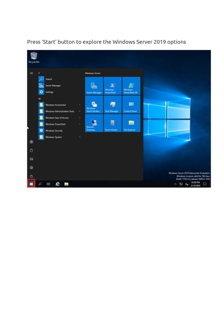 • Access tools via Start Menu: Server Manager, PowerShell, Administrative Tools, Control Panel, etc.